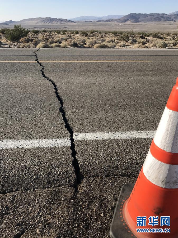 7月6日,在美国加利福尼亚州小镇特罗纳,道路在地震中受损。 美国加利福尼亚州南部地区4日和5日先后发生6.4级和7.1级地震,震中和附近地区遭不同程度破坏。两次强震震中所在地区圣贝纳迪诺县已经进入紧急状态。 新华社发(曾慧摄)