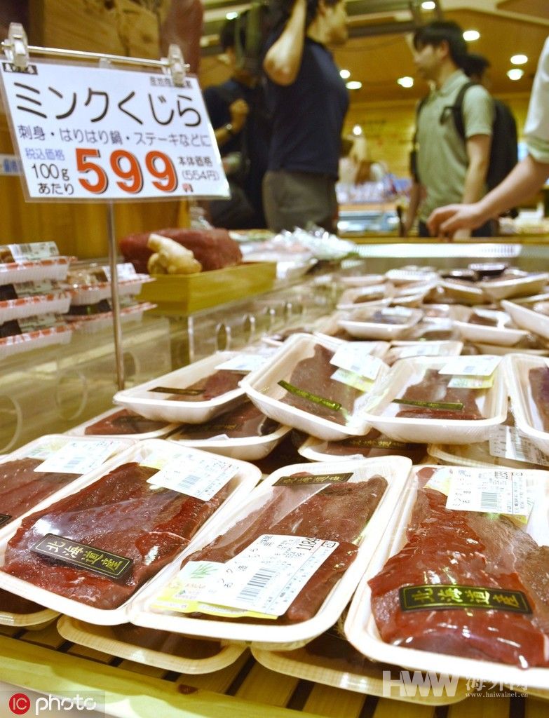 当地时间2019年7月8日,日本大阪,阪急百货超市内待售的小须鲸肉。进入7月,日本正式重启商业捕鲸。1日,来自日本多地共5艘小型捕鲸船从北海道钏路出港在临海作业并捕获两头小须鲸。这是日本时隔31年恢复商业捕鲸的首次收获。鲸鱼运回港口后被切割解体,上市销售。(文:新华国际 图:东方IC)