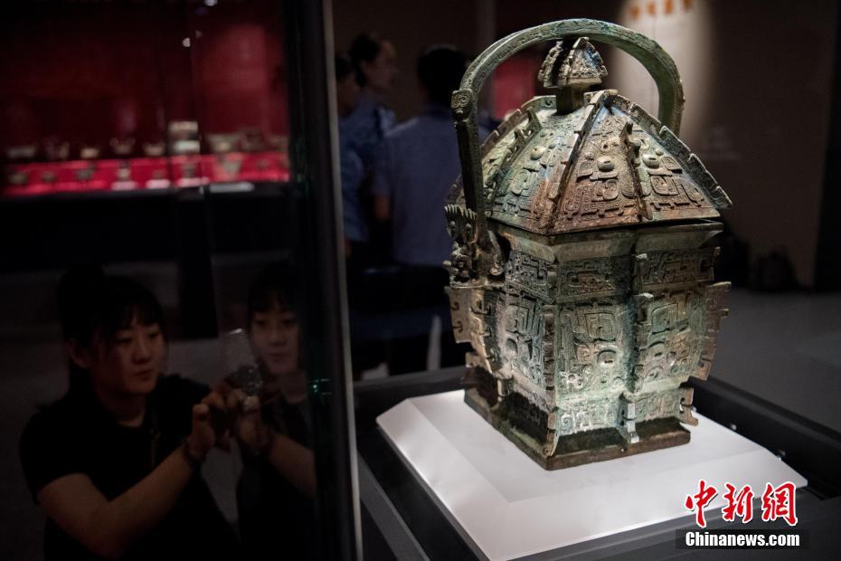 7月8日,在山西省太原市青铜博物馆,警方将追缴回国的文物“义尊”和“义方彝”陈列馆内,吸引多家媒体前来采访。山西警方此次从境外成功追回的西周时期青铜重器“义尊”和“义方彝”,均是国家一级文物。“义尊”和“义方彝”均为西周早期青铜器,从同一墓坑被盗,两件珍贵青铜器上有相同的铭文,均为“隹十又三月丁亥,武王赐义贝三十朋,用作父乙宝尊彝”。图为“义方彝”吸引参观者。中新社记者 韦亮 摄