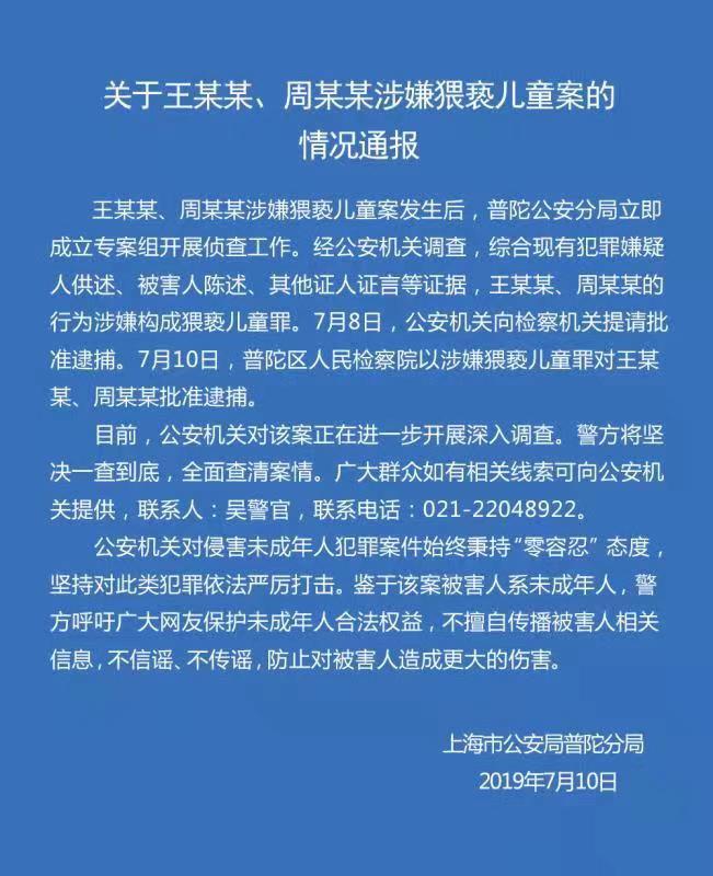 王某某、周某某涉嫌猥亵儿童案发生后,普陀公安分局立即成立专案组开展侦查工作。经公安机关调查,综合现有犯罪嫌疑人供述、被害人陈述、其他证人证言等证据,王某某、周某某的行为涉嫌构成猥亵儿童罪。7月8日,公安机关向检察机关提请批准逮捕。7月10日,普陀区人民检察院以涉嫌猥亵儿童罪对王某某、周某某批准逮捕。