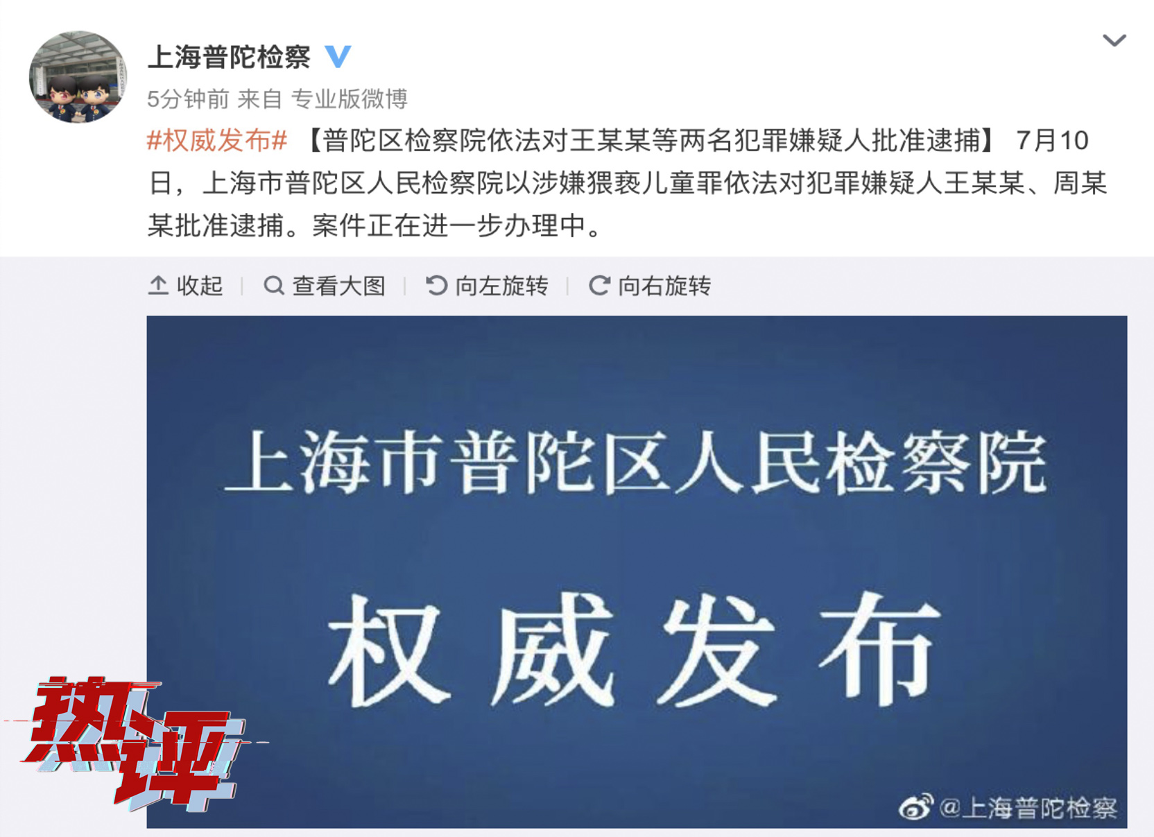 7月10日,受社会各界高度关注的“新城控股董事长王振华猥亵9岁女童”案有了最新进展:上海市普陀区人民检察院以涉嫌猥亵儿童罪依法对犯罪嫌疑人王某某、周某某批准逮捕。随后案件还将进入继续侦查、移交审查起诉……直至最终宣判。