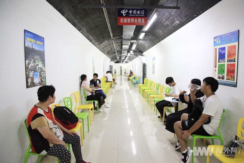 2019年7月10日,南京市内七处防空洞对外开放,供市民纳凉避暑。图为市民在北极岩防空洞内纳凉避暑。(视觉中国)