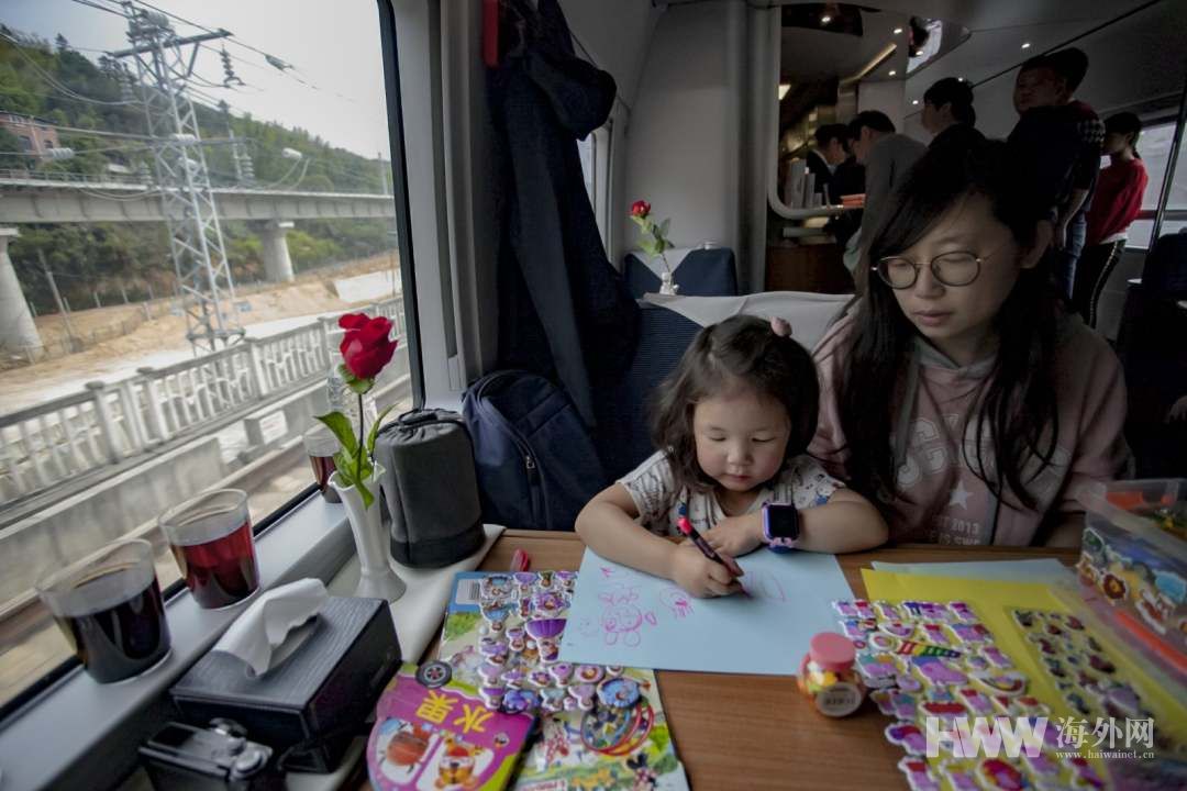 车上设立了移动儿童乐园,配备装有电源转换器、充电线、针线包、老花镜、鞋油等物品的便民服务箱。儿童园地丰富了小朋友旅客的旅途生活。