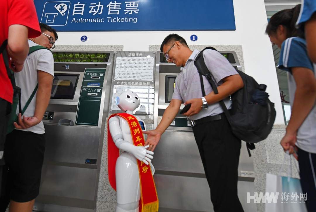 雄安新区白洋淀站首次使用智能机器人用粤语、英语、汉语标准话三种语言服务开往香港首趟列车的旅客问询服务。(摄影:孙立君)
