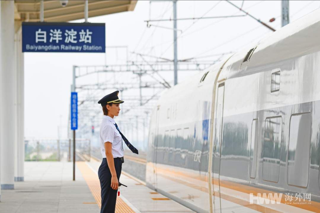 雄安新区白洋淀站客运员接发列车标准化作业。(摄影:孙立君)