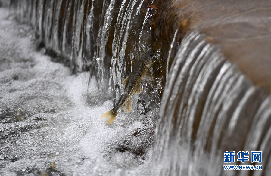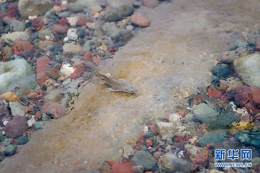 7月6日,在青海省刚察县沙柳河里,一条湟鱼向上洄游。新华社记者 吴刚摄