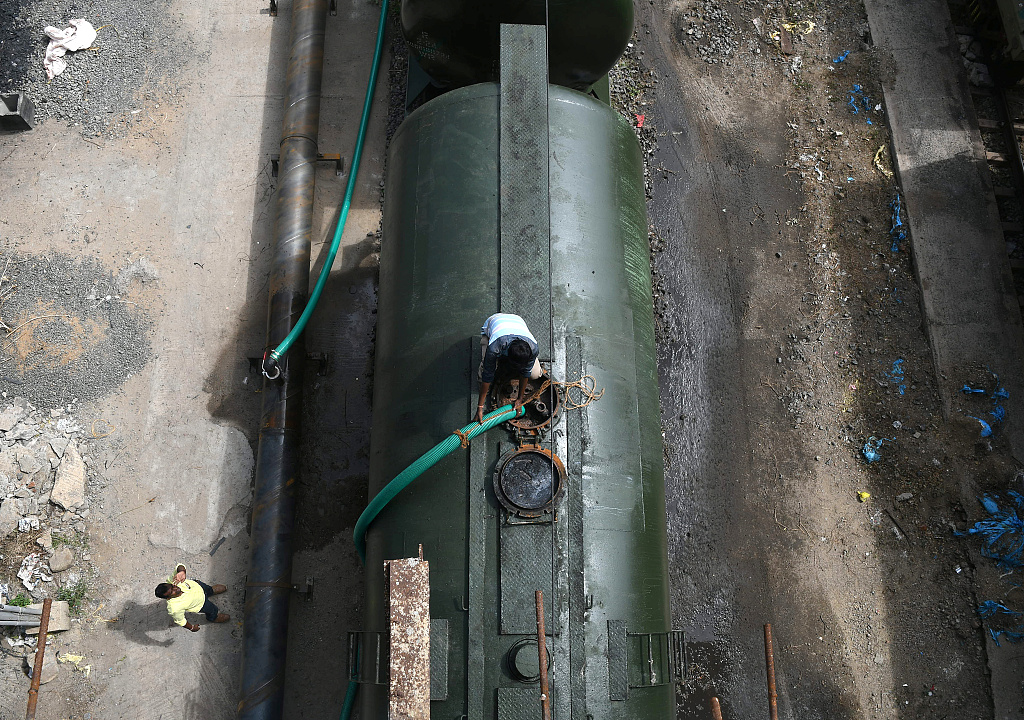 当地时间2019年7月11日,印度泰米尔纳德邦Jolarpettai,一名工人在火车站将运油火车车厢装满水,这些水将被运送到水短缺的金奈市。图源:视觉中国