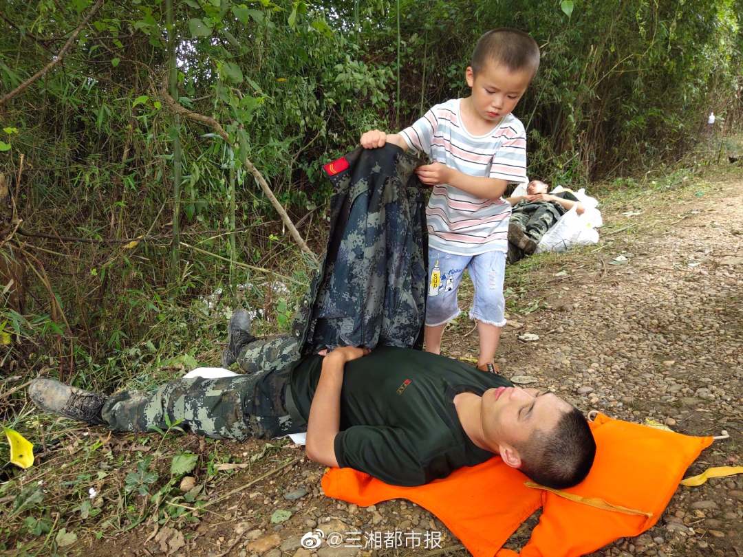 7月11日中午,在株洲渌口区南洲镇将军村通往村里的道路上,武警株洲支队抗洪官兵躺在马路边沉沉地睡着了,村里路过的一个小孩看见后,悄悄地拿起了地上的外套给叔叔盖上,给可爱的小朋友点个赞!(图片来源:三湘都市报微博)