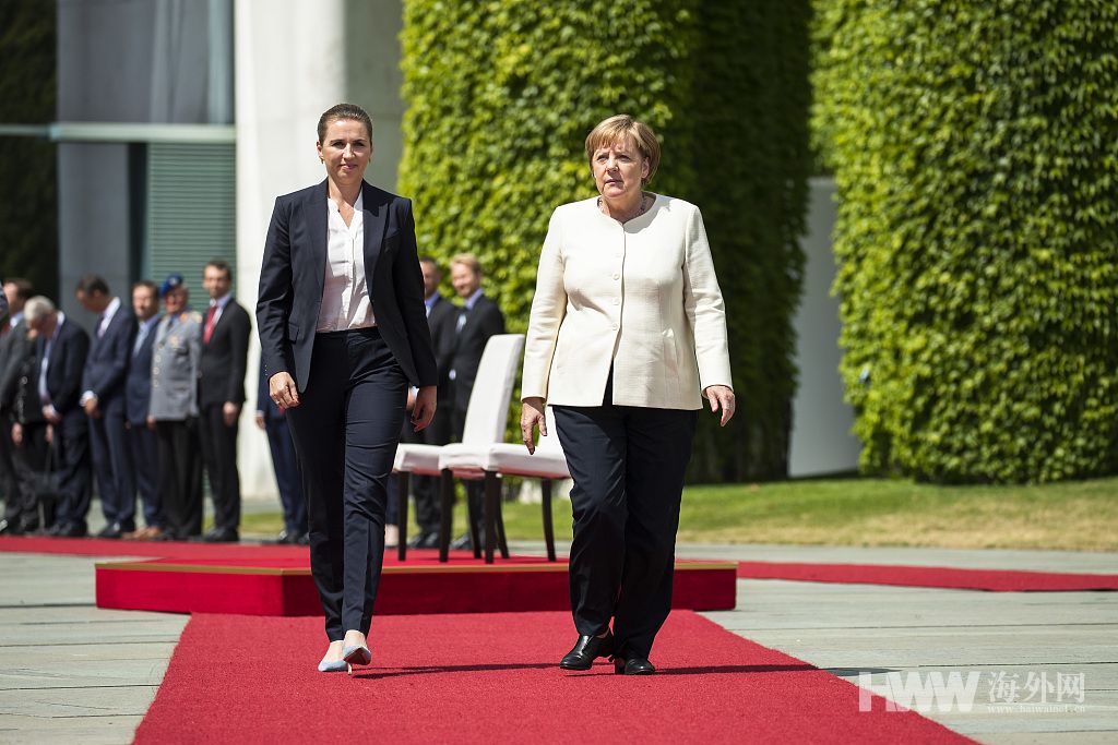 当地时间2019年7月11日,德国柏林,德国总理默克尔欢迎到访的丹麦首相弗雷德里克森,两人在欢迎仪式上坐着检阅仪仗队。(图:视觉中国)