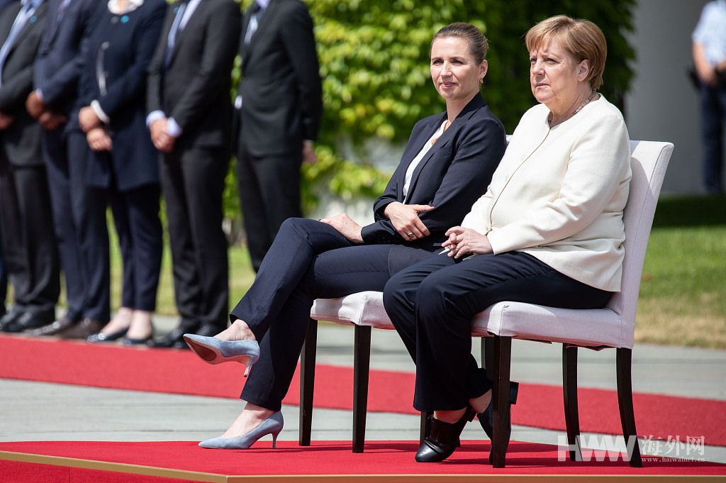 当地时间2019年7月11日,德国柏林,德国总理默克尔欢迎到访的丹麦首相弗雷德里克森,两人在欢迎仪式上坐着检阅仪仗队。(图:视觉中国)