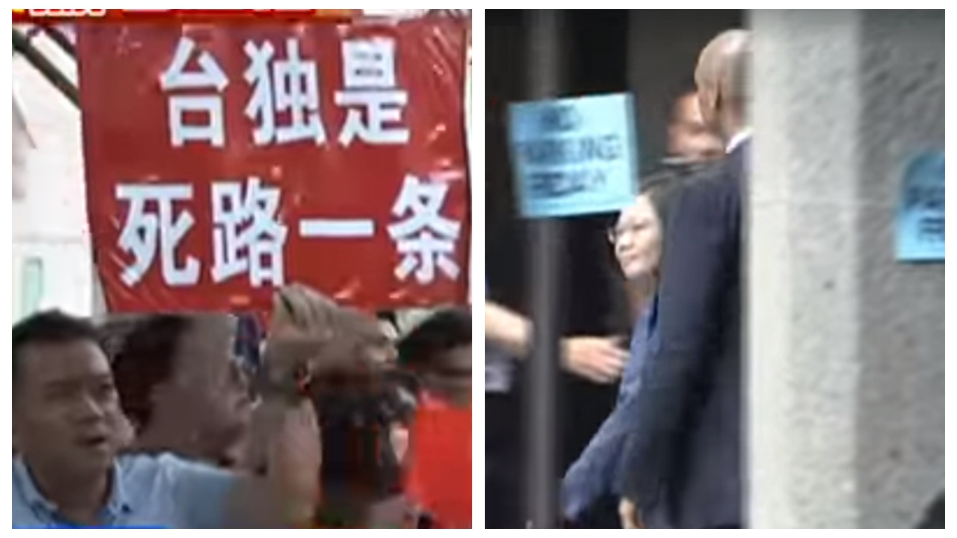 蔡英文走进会场时有民众在街对面高喊抗议口号(拼图,图片来源:台媒)