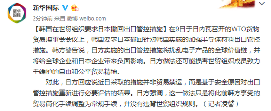 在9日于日内瓦召开的WTO货物贸易理事会会议上,韩国要求日本撤回针对韩国实施的加强半导体材料出口管控措施。韩方警告说,日方实施的出口管控措施将扰乱电子产品的全球价值链,并将给全球企业和日本企业带来负面影响。日方做法还可能损害世贸组织成员致力于维护的自由和公平贸易精神。