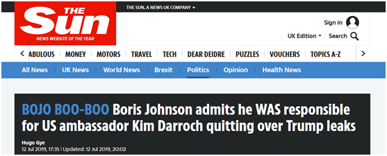 “鲍里斯•约翰逊承认对美国大使金•达罗克因一起与特朗普有关的泄密事件而辞职负有责任”,英国《太阳报》12日以此为题报道说,英国首相热门人选约翰逊当天接受英国广播公司(BBC)采访时承认,自己此前明确表示拒绝支持达罗克是导致这位英国驻美大使辞职的“因素”之一。不过,据报道,约翰逊坚称,自己的上述言论“被金(达罗克)曲解了”。