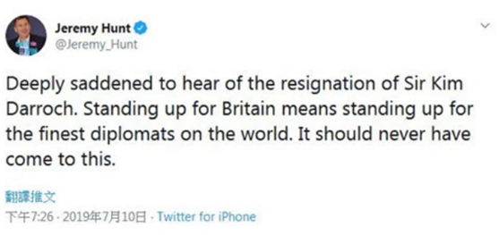 与约翰逊不同的是,其竞选对手现任外交大臣杰里米•亨特10日则通过推特对达罗克的辞职表示“难过”。亨特说,“听到金•达罗克爵士辞职,我感到非常难过。捍卫英国意味着捍卫世界上最优秀的外交官。这件事绝不应该发展到这种地步。”