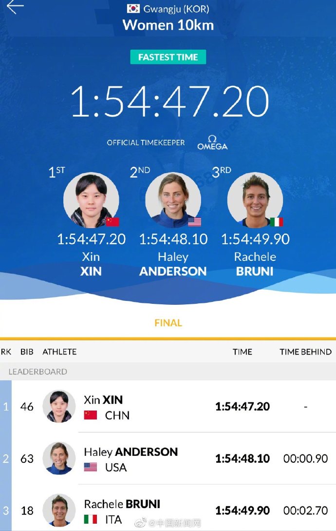 北京时间14日早晨,2019游泳世锦赛女子10Km公开水域比赛中,中国名将辛鑫游出1:54:47.20秒的成绩,以领先美国选手0.9秒的微弱优势夺冠,这也是中国游泳历史上首枚世锦赛公开水域冠军。
