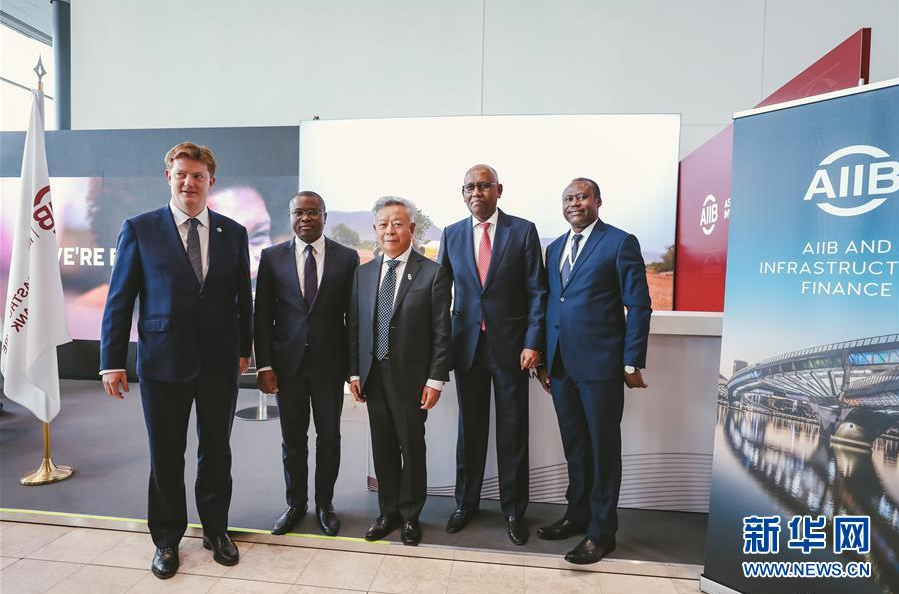 7月13日,亚投行行长金立群(中)与新加入亚投行的贝宁(左二)、吉布提(右二)和卢旺达(右一)代表合影。 新华社记者 张铖 摄