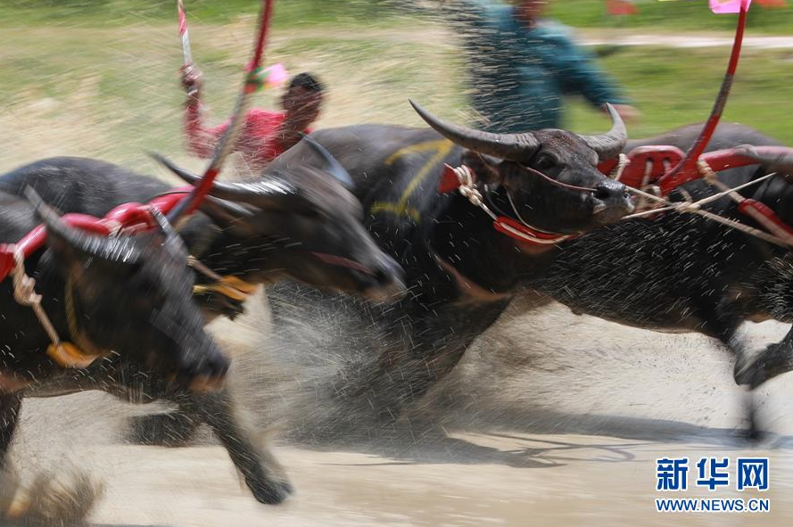 7月13日,在泰国春武里府赛牛节上,参赛者驾驭水牛参加比赛。新华社记者 张可任 摄