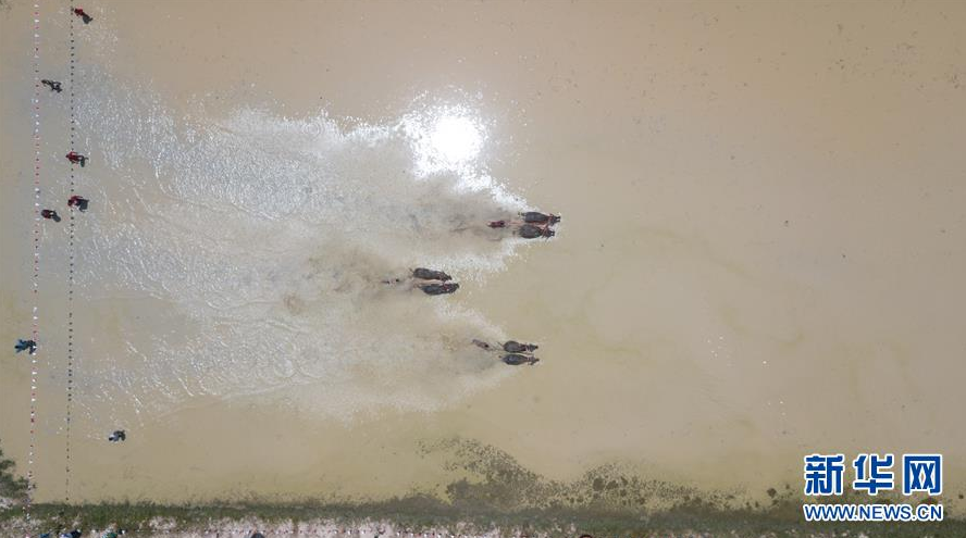 7月13日,在泰国春武里府赛牛节上,参赛者驾驭水牛参加比赛。新华社记者 张可任 摄