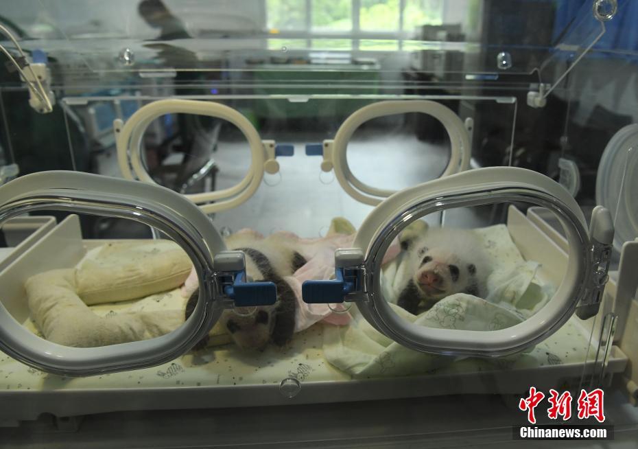 双胞胎熊猫幼仔正在保温箱内活动。陈超 摄