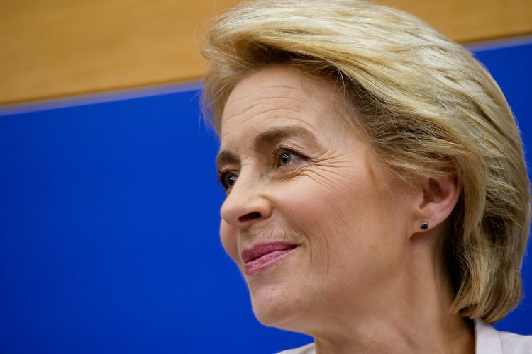 2019年7月16日,在法国斯特拉斯堡欧洲议会总部,冯德莱恩当选为下届欧盟委员会主席后出席新闻发布会。(新华社记者 张铖 摄)