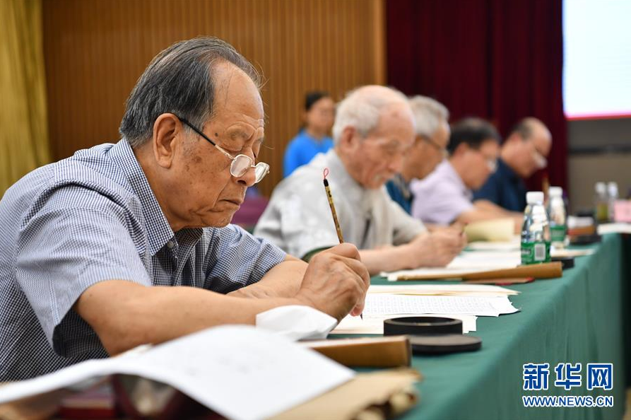 7月16日,陕西师范大学退休教师耿征(左一)在书写录取通知书。当日,陕西师范大学2019年录取通知书的书写工作正式开始。该校自2007年起采用毛笔书写录取通知书的方式,为新生传递佳音。一份份带着墨香的录取通知书被网友们称为最好的“开学第一课”。新华社记者 张博文 摄