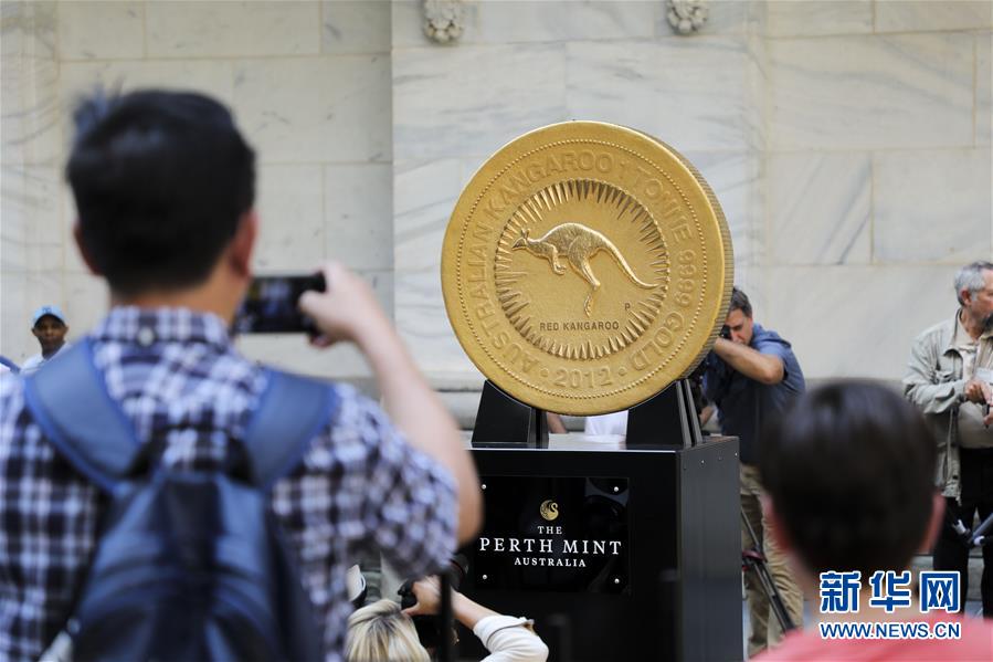 7月16日,人们在美国纽约证券交易所前观看超大金币。 当天,一枚重达一吨的金币在纽约展出,以庆祝一家澳大利亚黄金交易所的基金在纽约证券交易所上市。这枚金币由99.99%纯金铸造,直径约80厘米,厚度超过12厘米。 新华社记者 王迎 摄