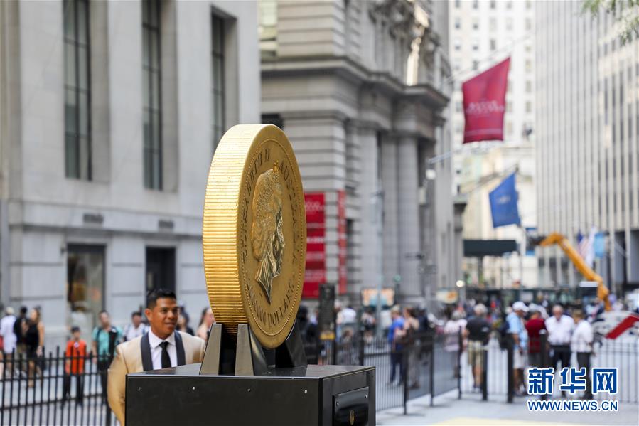 7月16日,超大金币在美国纽约证券交易所前展示。 当天,一枚重达一吨的金币在纽约展出,以庆祝一家澳大利亚黄金交易所的基金在纽约证券交易所上市。这枚金币由99.99%纯金铸造,直径约80厘米,厚度超过12厘米。 新华社记者 王迎 摄