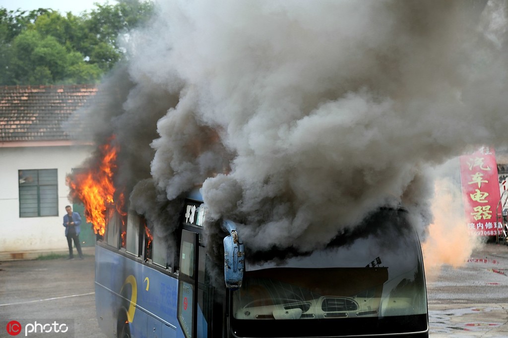 2019年7月17日上午,甘肃省平凉市崆峒区组织开展2019年运输企业消防安全知识讲座暨客运车自燃灭火演练活动。图为演练现场。图源:东方IC