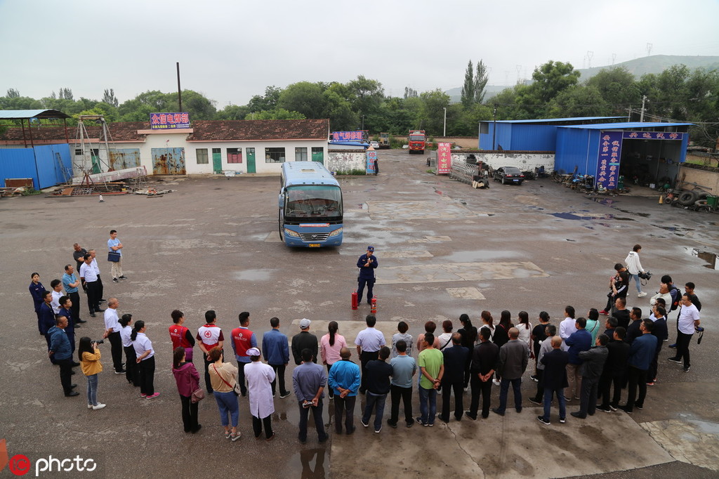 2019年7月17日上午,甘肃省平凉市崆峒区组织开展2019年运输企业消防安全知识讲座暨客运车自燃灭火演练活动。图为演练现场。图源:东方IC