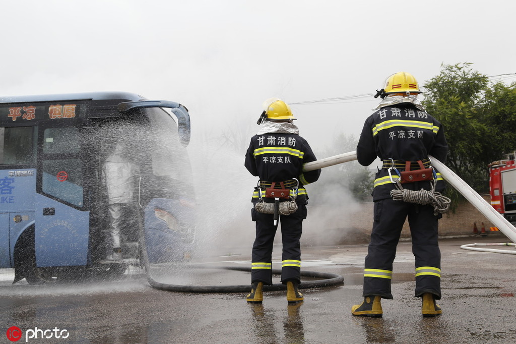 甘肃平凉开展客车灭火救援演练 紧贴实战场面震撼