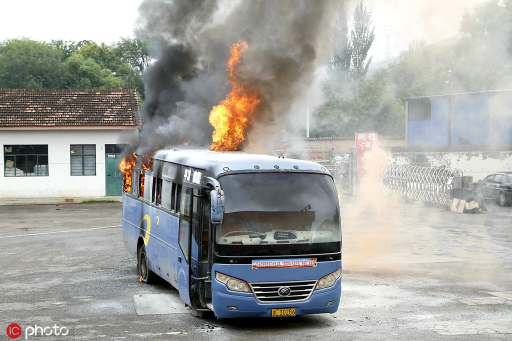 2019年7月17日上午,甘肃省平凉市崆峒区组织开展2019年运输企业消防安全知识讲座暨客运车自燃灭火演练活动。图为演练现场。图源:东方IC