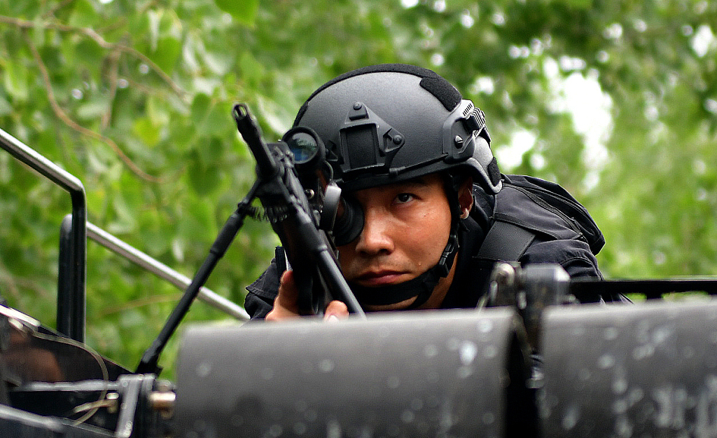 2019年7月16日,洛阳市公安局特警支队,特警全副武装进行实战演练。进入暑期,洛阳特警无惧高温“烤”验,贴近实战夏训练兵,提升快速反应和处突实战能力,打造一支关键时刻“拉得出、打得赢、战得胜”的尖刀队伍,为新中国成立70周年洛阳安保维稳护航。(来源:视觉中国)