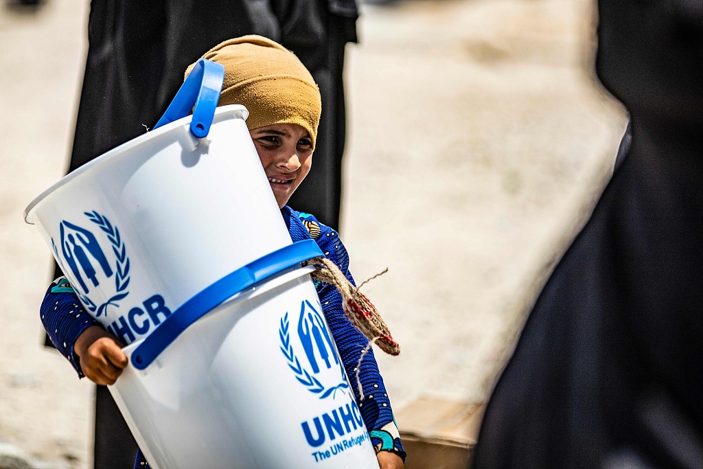 叙利亚难民领取联合国援助包裹 儿童赤脚走路一脸迷茫