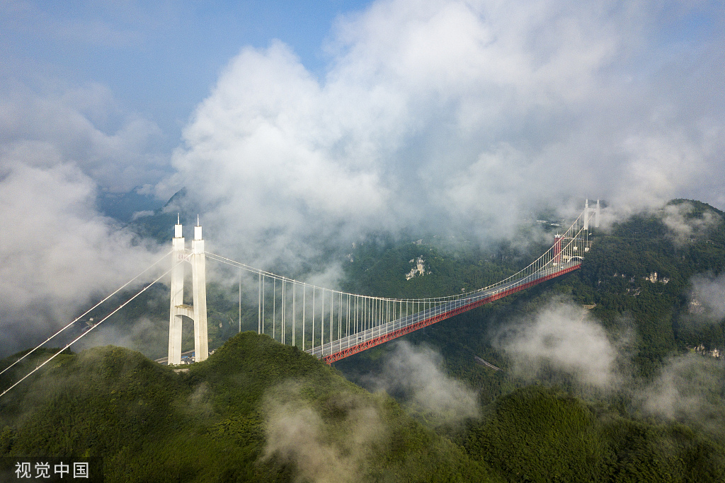 2019年7月24日,湖南省湘西土家族苗族自治州吉首市矮寨镇,航拍矮寨特大悬索桥周围云雾缭绕。