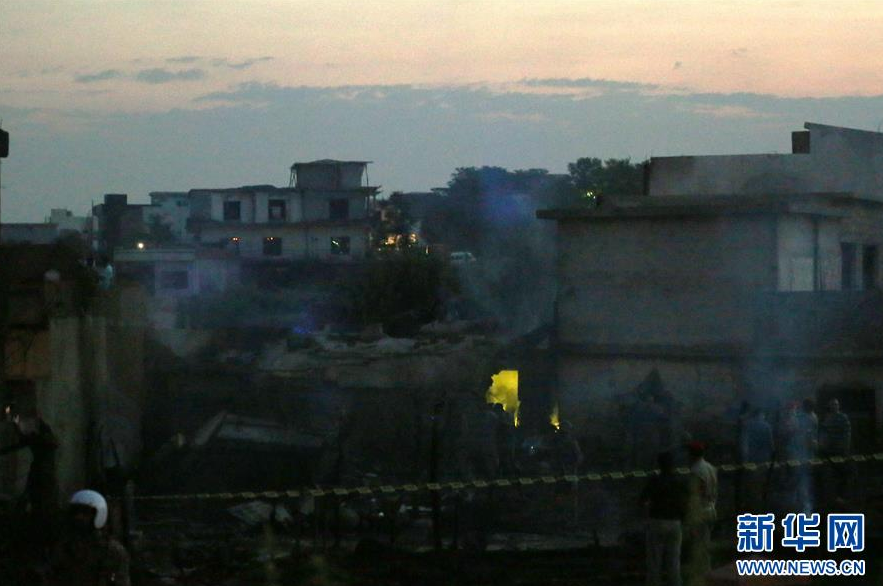 7月30日,在巴基斯坦拉瓦尔品第市郊区,坠机现场冒起白烟。 新华社发(艾哈迈德·卡迈勒摄)
