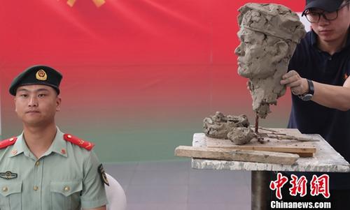 8月1日,中国美术馆在艺术教育空间举办“为新时代人物塑像——‘八·一’建军节为军人塑像” 活动。图为艺术家为常年驻守在中国美术馆的驻馆武警战士塑像。中新社记者 杜洋 摄