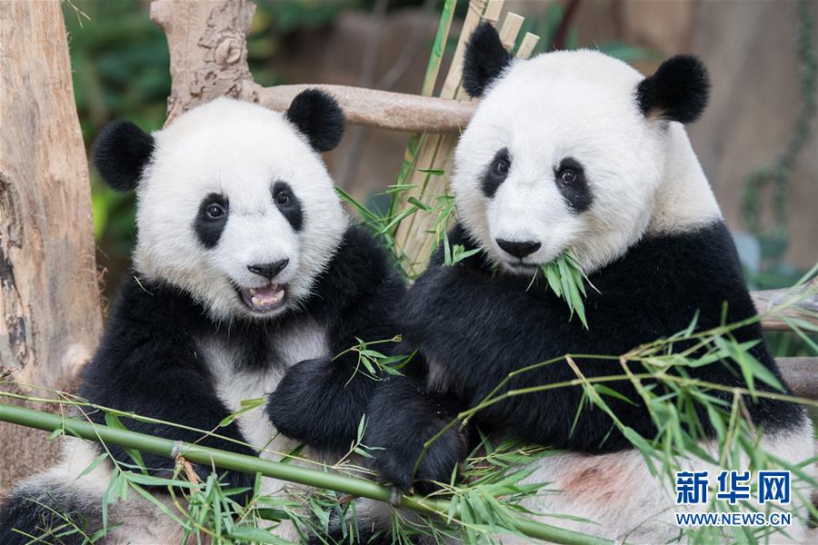 8月1日,在马来西亚吉隆坡附近的马来西亚国家动物园,大熊猫宝宝“谊谊”(左)和妈妈“靓靓”在吃竹子。 当日,马来西亚将在马出生的第二只雌性大熊猫宝宝取名为“谊谊”。“谊谊”是中国旅马大熊猫“兴兴”和“靓靓”所生的第二只大熊猫宝宝,于2018年1月14日出生。 新华社记者朱炜摄