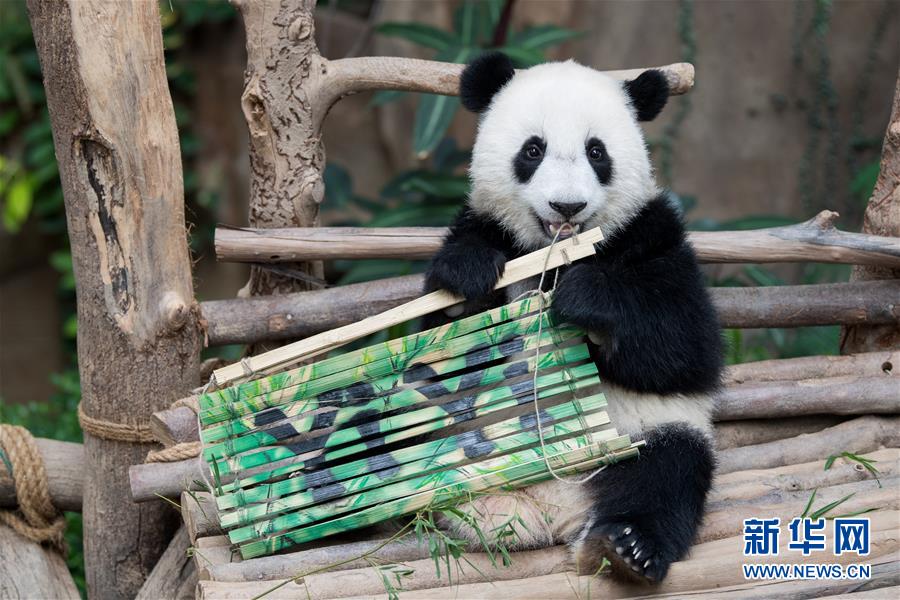 8月1日,在马来西亚吉隆坡附近的马来西亚国家动物园,大熊猫宝宝“谊谊”拿着写有自己名字的竹简。 当日,马来西亚将在马出生的第二只雌性大熊猫宝宝取名为“谊谊”。“谊谊”是中国旅马大熊猫“兴兴”和“靓靓”所生的第二只大熊猫宝宝,于2018年1月14日出生。 新华社记者朱炜摄