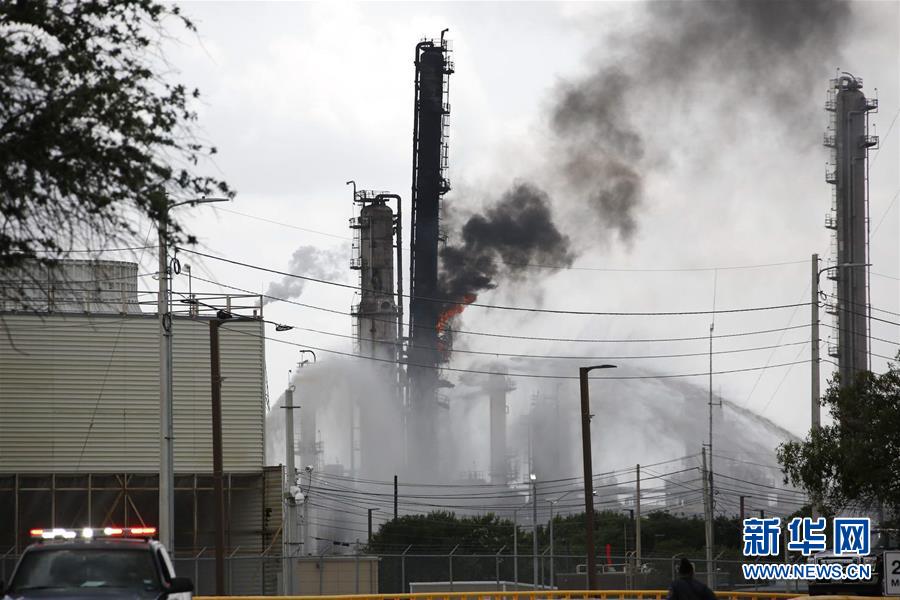 7月31日,在美国得克萨斯州贝敦市,发生火灾的炼化厂升起浓烟。 美国得克萨斯州一家炼化厂7月31日发生火灾,导致37人受轻伤。 新华社发(劳承跃摄)