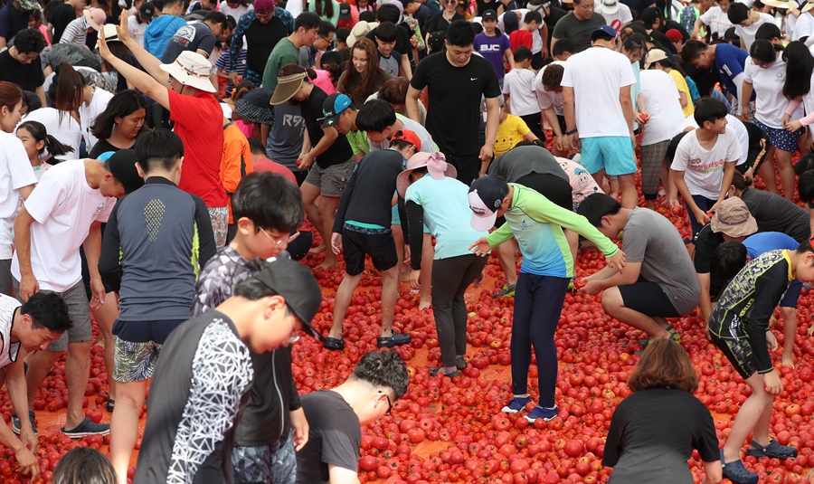 韩国华川西红柿节狂欢嗨翻天 民众番茄海中“捞”戒指