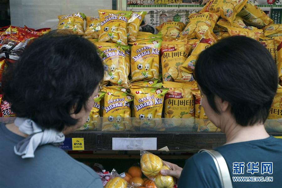 8月2日,在日本首都东京的新大久保,商店货架上摆放着韩国生产的商品。 新华社/美联