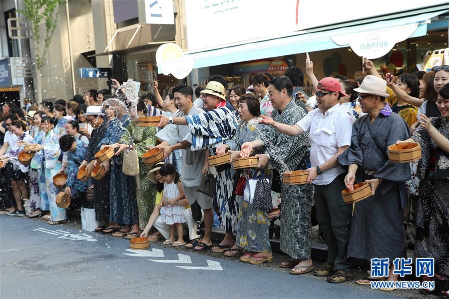 8月3日,日本东京银座举办活动,当地市民和游客在银座街道上泼水,为街道降温,带来清凉。许多参与者身着传统服装浴衣加入活动,形成夏日里一道风景线。新华社记者杜潇逸摄