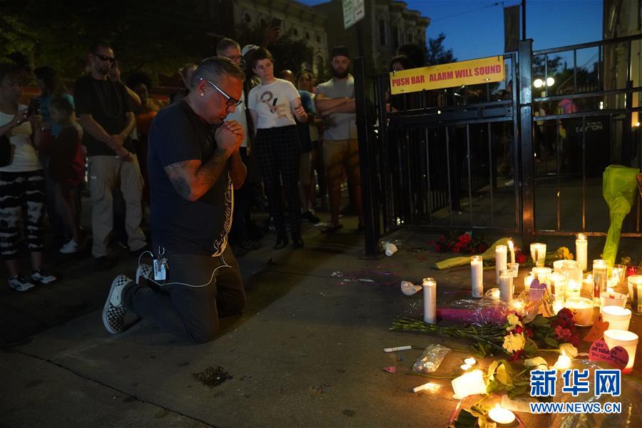 8月4日,在美国俄亥俄州代顿市,人们为枪击事件遇难者举行悼念活动。 美国俄亥俄州代顿市市长娜恩·惠利4日清晨通报说,当天凌晨该市发生的枪击事件目前已造成包括一名枪手在内的10人死亡,另有26人受伤。 新华社记者 刘杰 摄