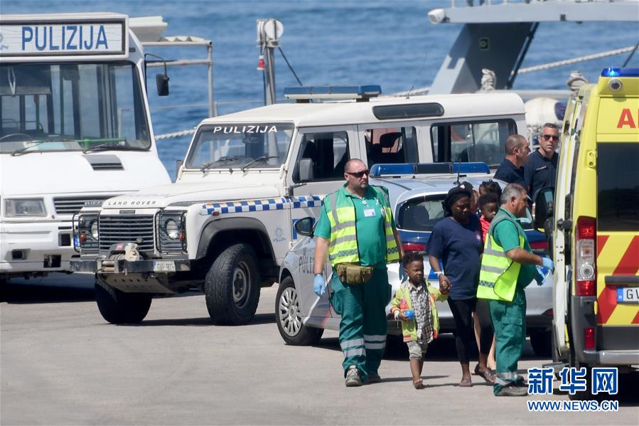 8月4日,在马耳他弗洛里亚纳,带着儿童的非法移民准备乘坐救护车。 当日,40名非法移民在马耳他弗洛里亚纳上岸。船上非法移民主要是西非人,他们自称来自喀麦隆、加纳、利比里亚、多哥和马里等国。 新华社发(乔纳森·博格 摄)