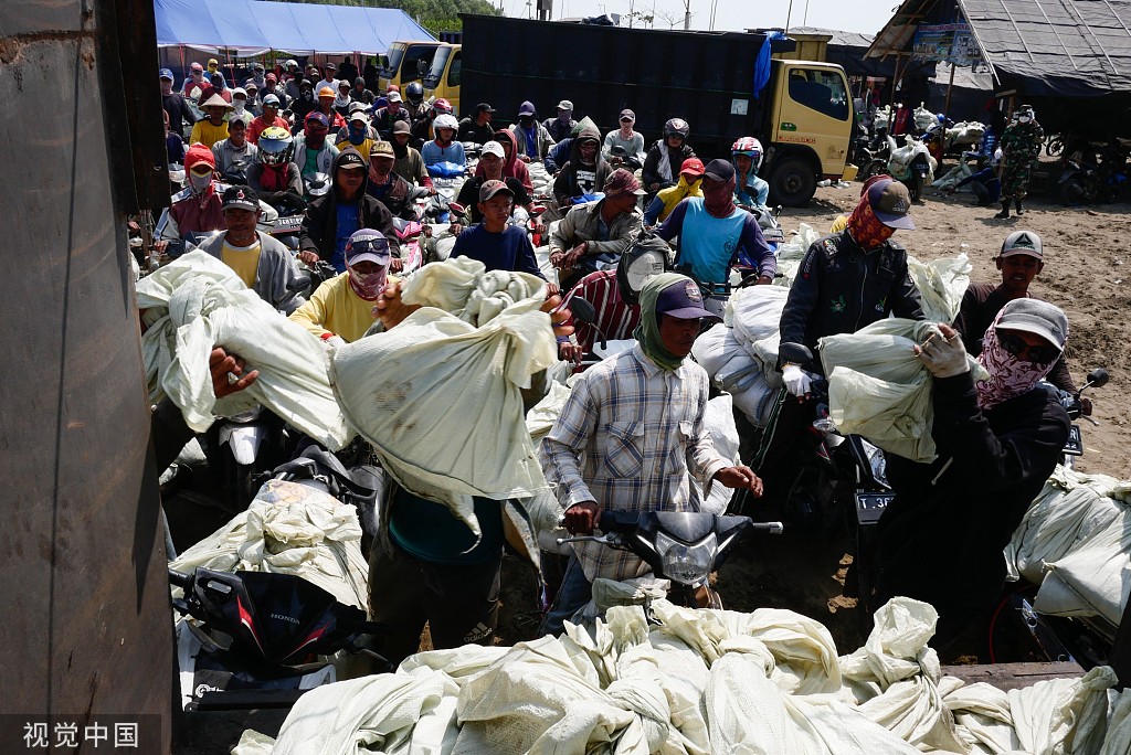 当地时间2019年8月4日,印度尼西亚西爪哇卡拉旺,人们在海滩上清理泄露的石油。印尼国家石油公司YYA-1号海上钻井平台发生了漏油事故。图源:视觉中国