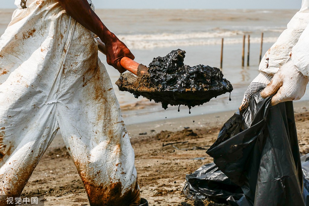 当地时间2019年8月4日,印度尼西亚西爪哇卡拉旺,人们在海滩上清理泄露的石油。印尼国家石油公司YYA-1号海上钻井平台发生了漏油事故。图源:视觉中国