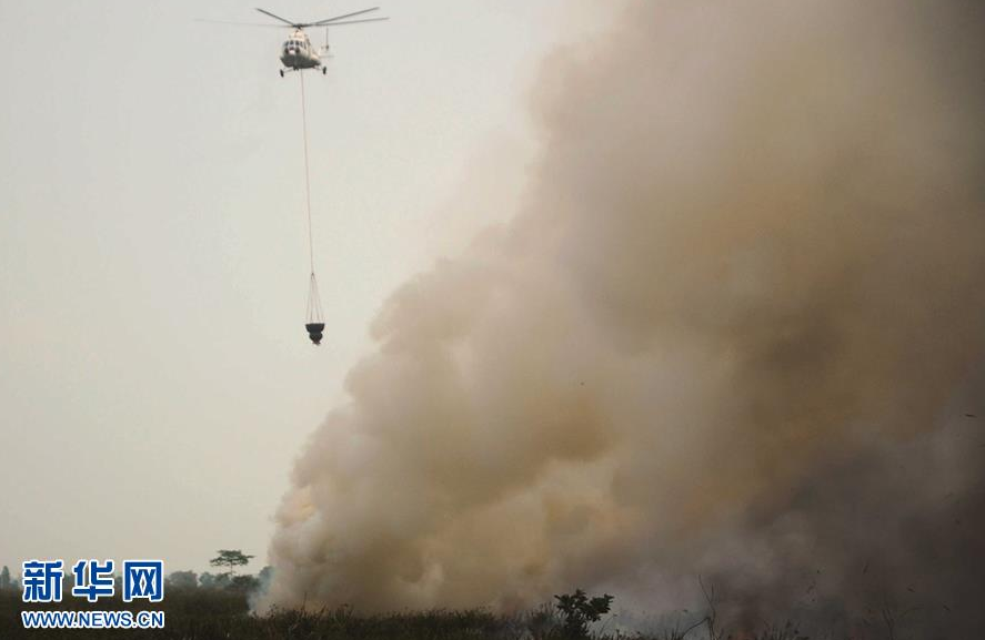8月5日,在印度尼西亚南苏门答腊省,一架直升机参与灭火。 近日,印度尼西亚南苏门答腊省一处泥炭地发生火灾,当地政府部署近六千名人员参与灭火。 新华社发(穆罕默德 摄)