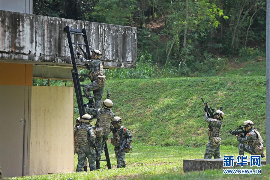 8月5日,中方官兵在新加坡慕莱城市战训练中心参与城市反恐实兵综合演练。 当日,“合作-2019”中国与新加坡陆军联合训练在新加坡举行闭幕仪式。 新华社发(邓智炜摄)