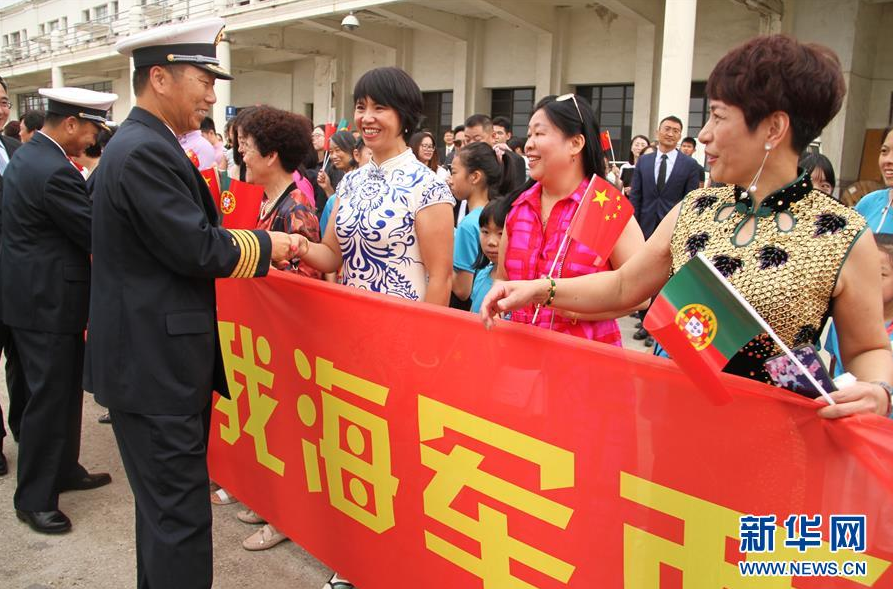 8月6日,在葡萄牙里斯本港,中国海军西安舰军官与前来迎接的群众握手。 中国海军第三十二批护航编队西安舰当地时间6日上午抵达葡萄牙里斯本港,开启为期三天的技术补给。 新华社记者 温新年 摄