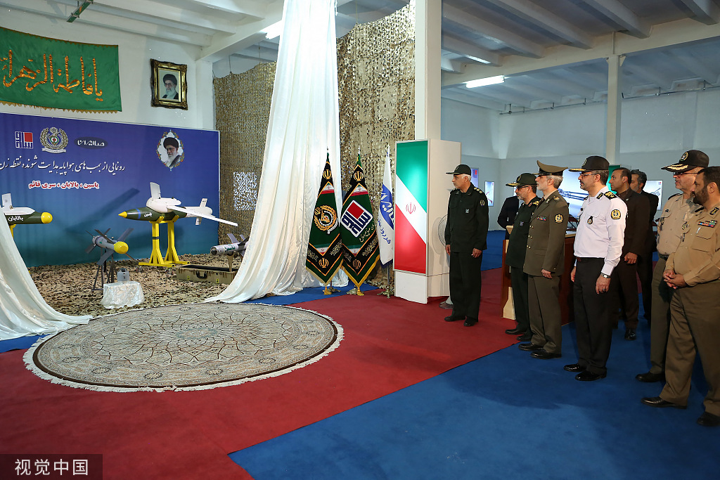 当地时间2019年8月6日,伊朗德黑兰,伊朗国防部长哈塔米当天在德黑兰的推介仪式上,介绍了该部与伊朗电子工业公司共同开发的三种新型导弹。图源:视觉中国